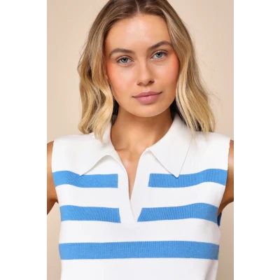 Unbelievably Chic White Striped Collared Sleeveless Sweater Top